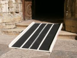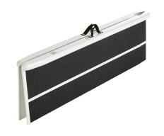 leicht verstaubare Kofferrampe aus Fiberglas. Die Rampe wird längs in der Mitte gefaltet und ist somit wie ein Koffer mit einem Handgriff zu tragen. Die Länge beträgt 914 mm, 1370 mm oder 1830 mmdie befahrbare Innenbreite 736 mm, die Gesamtbreite 840 mm. Das Eigengewicht beträgt nur 7 kg.